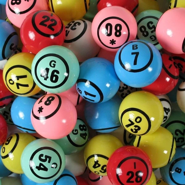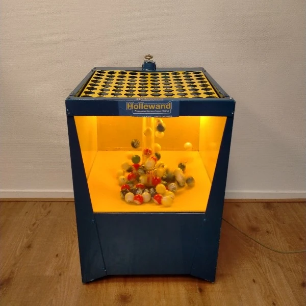 Grote bingomachine welke de balletjes omhoog blaast. Deze machine bevat 75 bingoballen.
