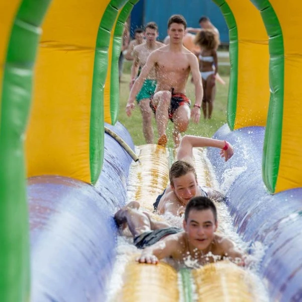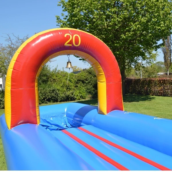 Deze 23 meter lange attractie bestaat uit 2 buikschuifbanen met elk een zwembad aan het eind. Altijd een spektakel om te huren! Wie haalt het einde van deze extra lange opblaasbare glijbaan?! Verhuur van buikglijbanen worden ook veel gebruikt voor een sportdag, zeskamp, sportevenement maar ook op campings en scholen.