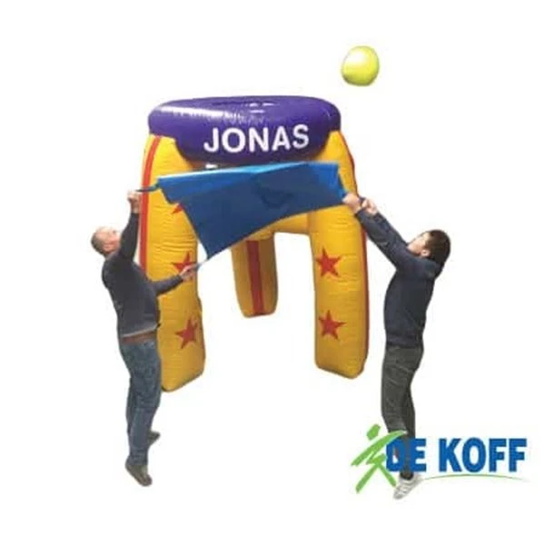 Twee deelnemers houden samen een jonaszeiltje vast en proberen door goede samenwerking een bal in de grote opblaasbare basket te gooien. Klinkt simpel? Wacht maar tot je het probeert! Ideaal voor kinderen vanaf 6 jaar, maar ook volwassenen doen graag mee voor de fun. Een gegarandeerde hit bij elk evenement!