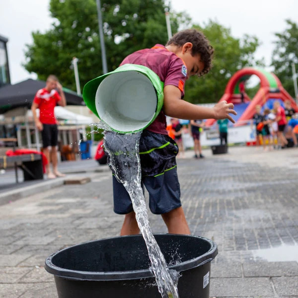 Vul de emmer met water en ren zo snel mogelijk naar de overkant. Hoeveel water hou jij over in de emmer?