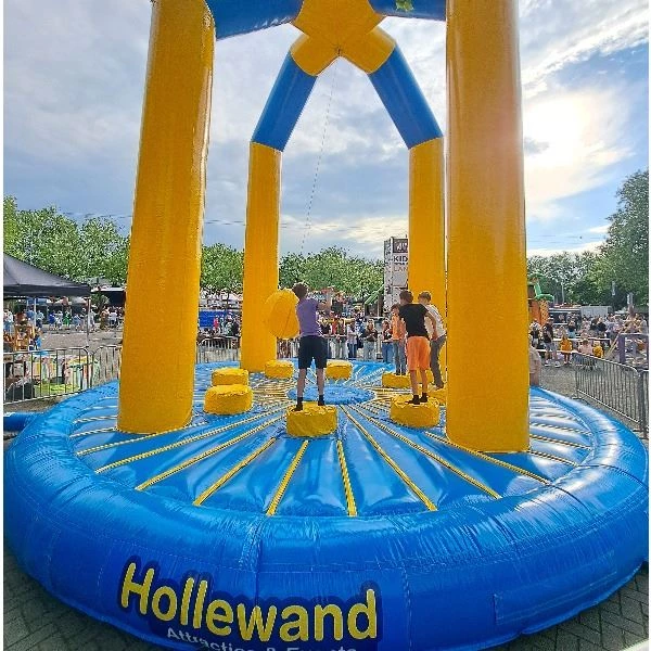 Dit nieuwe spelkussen heeft als doel elkaar eraf te krijgen door middel van de gigantische bal in het midden. Ga staan op één van de 8 plekken en slinger zo hard mogelijk de bal tegen de tegenstander. Maar let op, verlies niet je evenwicht, want dan val je er zelf af! Met een capaciteit voor 8 personen is de slingerbal een geweldige attractie om te spelen.. maar ook zeker zo hilarisch om te aanschouwen. De slingerbal is een ideale attractie voor een zeskamp.