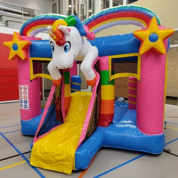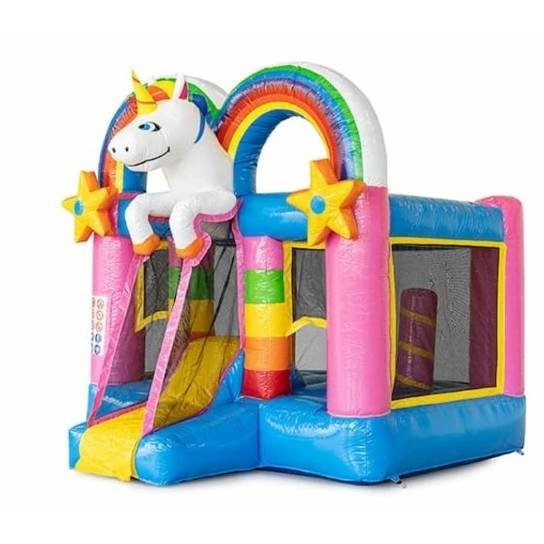 Bezorg kinderen de dag van hun leven met deze Mini Unicorn. Dit compacte kussen past in vrijwel iedere achtertuin of oprit. Ideaal, want zo is dit springkussen al snel overal te plaatsen. De wanden en handig geplaatste netten zorgen voor extra veiligheid en ruimt voor toezicht. Op het springvlak zijn obstakels geplaatst en er is een coole glijbaan in het midden.