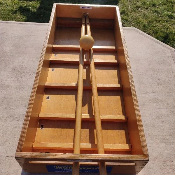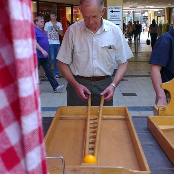 Plaats de bal achter op de beide stokken. Door de stokken naar buiten te bewegen zal de bal naar voren rollen. Wanneer de bal stil ligt, moet u de stokken naar buiten bewegen. Dan zal de bal in één van de gaten vallen. Leuk Oudhollands spel om te huren.
