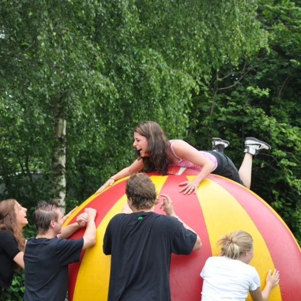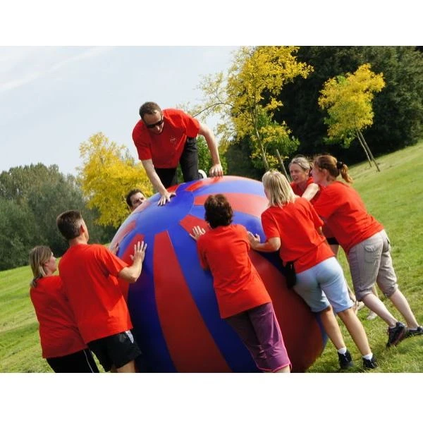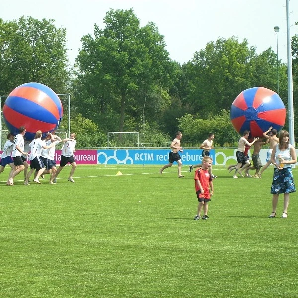 Deze grote opblaasbare bal van 2 meter doorsnede, een Wereldbal, is een ongekend populair onderdeel van sportdagen, meerkampen of sportdagen. Spelers kunnen hierop zitten of rollend een parcours af leggen.