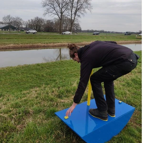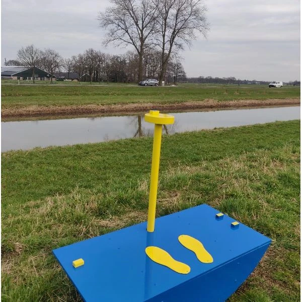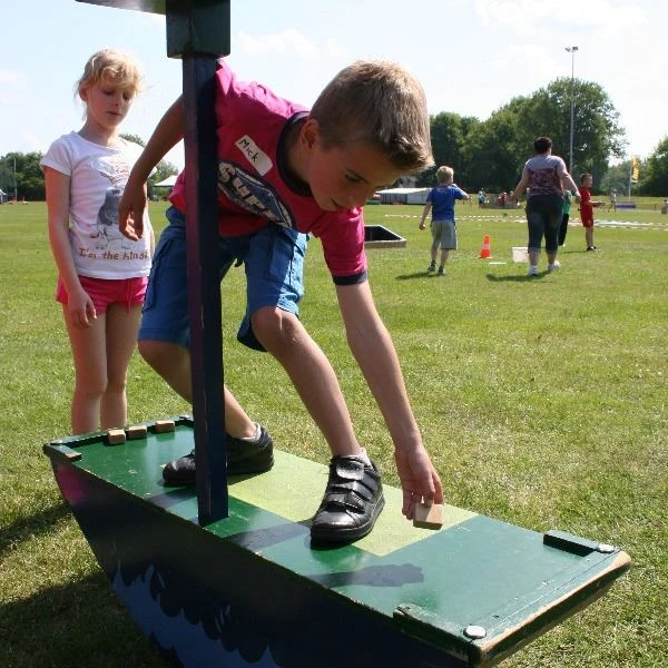 De wiebelbak is een lastig behendigheidsspel, kan jij blijven staan? Het is de bedoeling om een blokje op te pakken zonder om te vallen en uw voeten moeten op de voetafdruk blijven staan. Zodra dit is gelukt legt u het blokje op de plank en manouvreert u net zo lang totdat u alle blokjes op de plank heeft liggen.